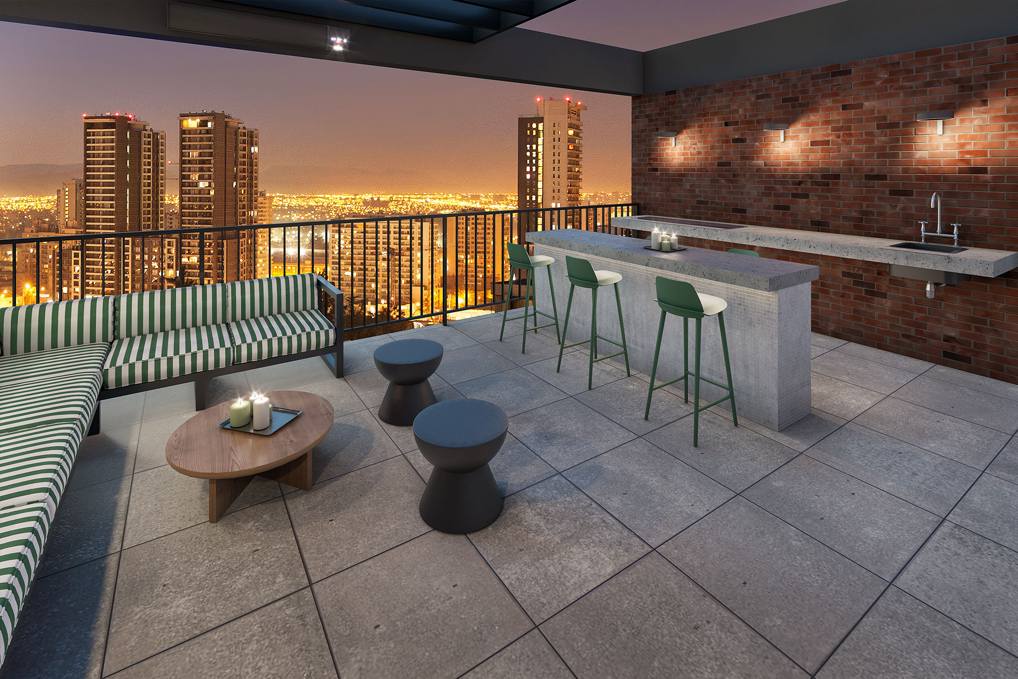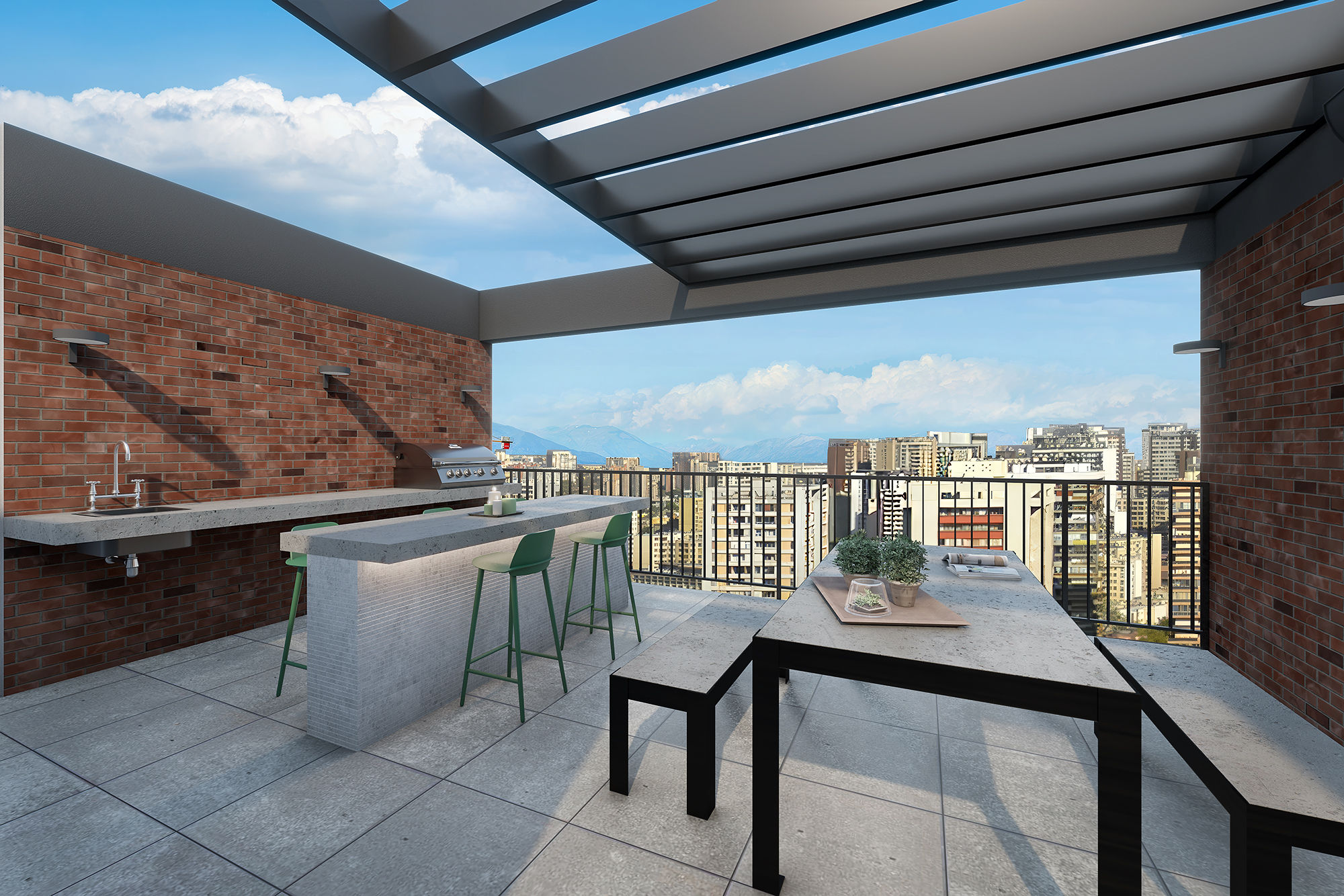 Espacios Comunes | Área de aseo para mascotas, Bar, Bicicletero, Gimnasio, Jardines, Lavandería, Piscina panorámica, Quinchos, Sala de Co-Work, Sala Multiuso, Salón Gourmet |